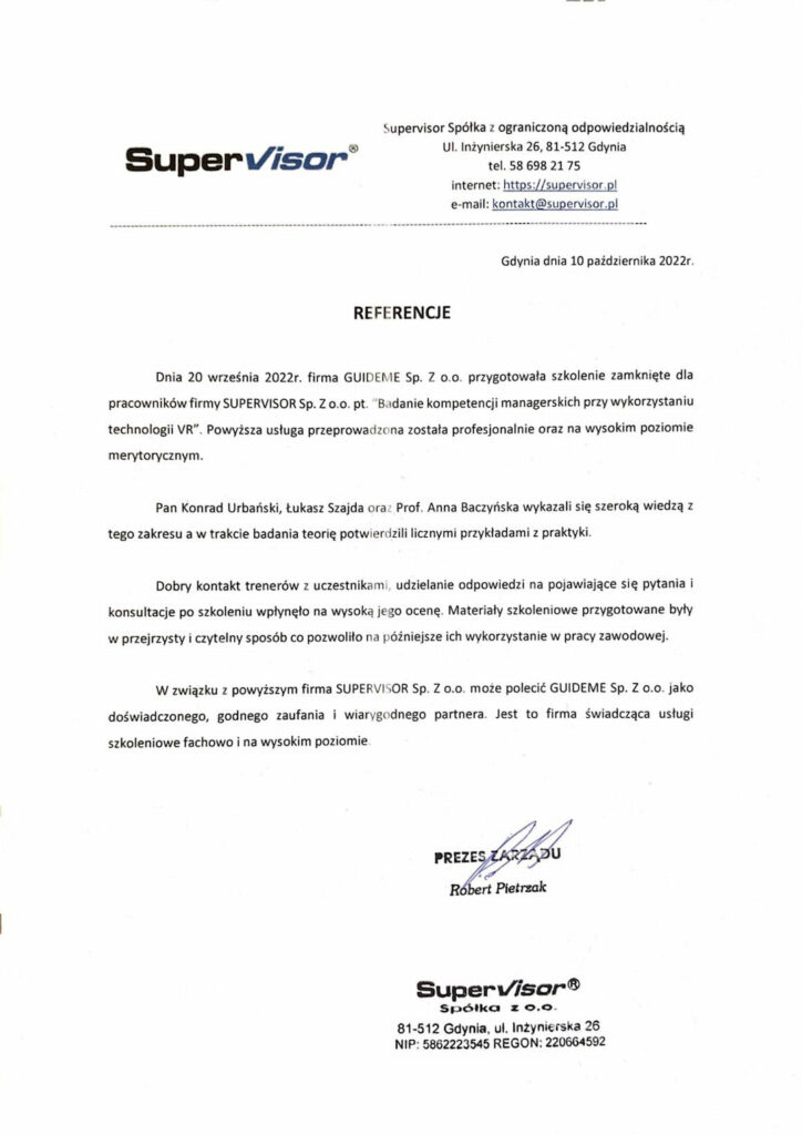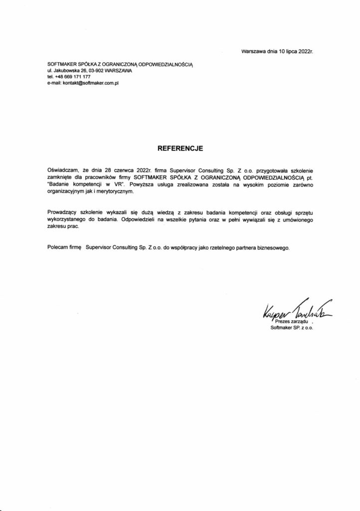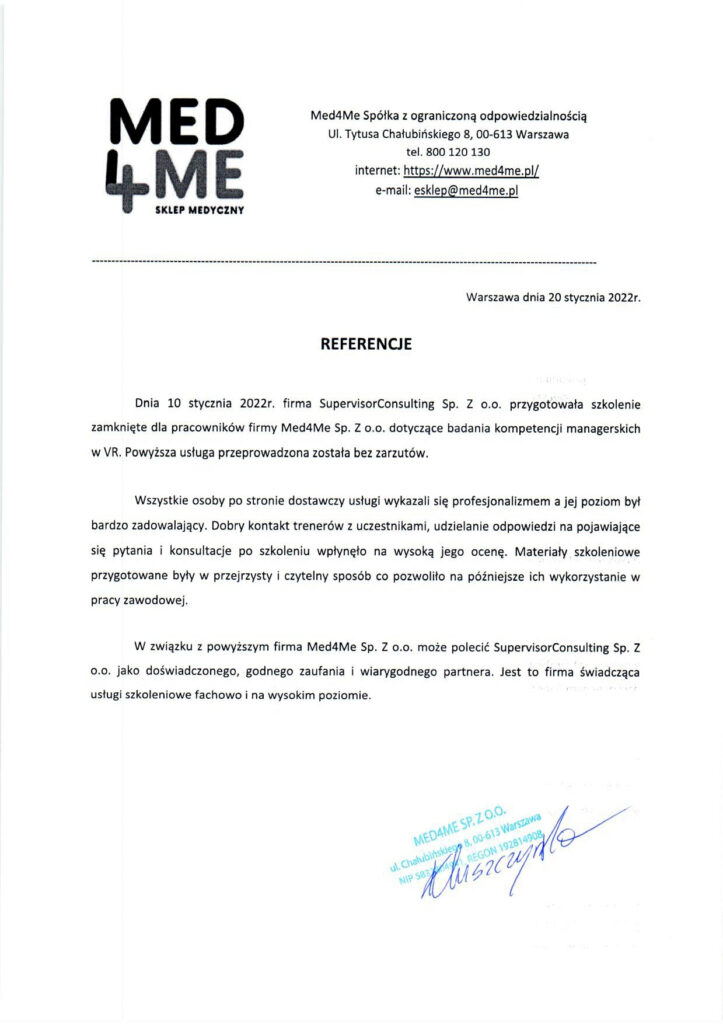 Od 2022 roku realizujemy szkolenia z wykorzystaniem technologii Virtual Reality dla firm z różnych branż. Firmy takie jak Med4Me, Softmaker i Supervisor doceniły profesjonalizm, wysoką jakość materiałów szkoleniowych oraz praktyczne podejście do rozwoju kompetencji managerskich. Zobacz, co mówią o współpracy z nami klienci i dowiedz się, dlaczego warto postawić na innowacyjne metody szkoleniowe.